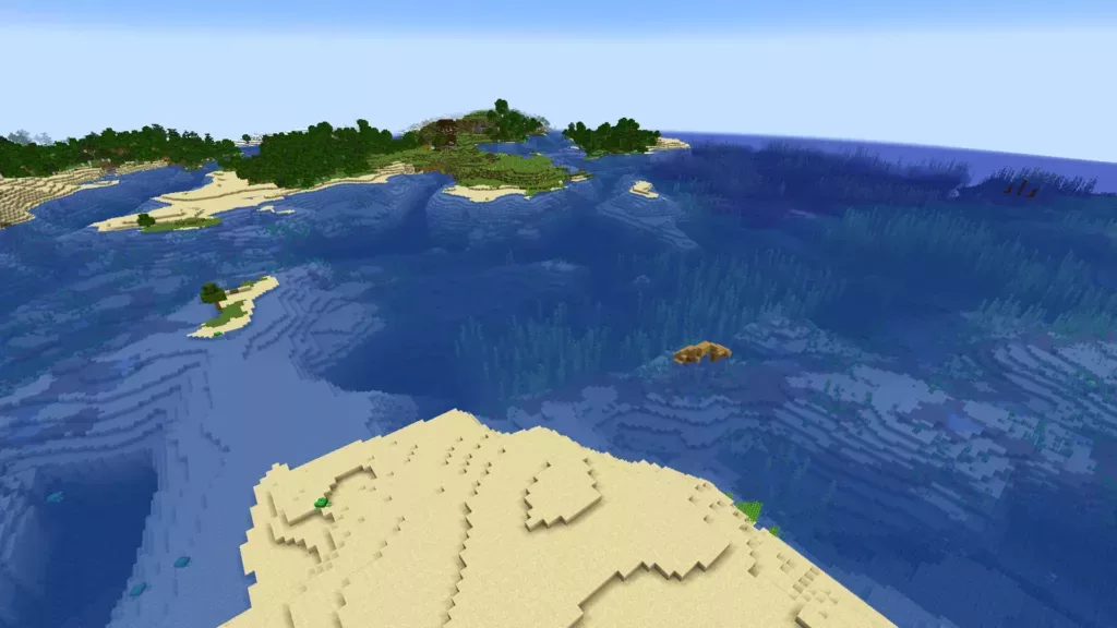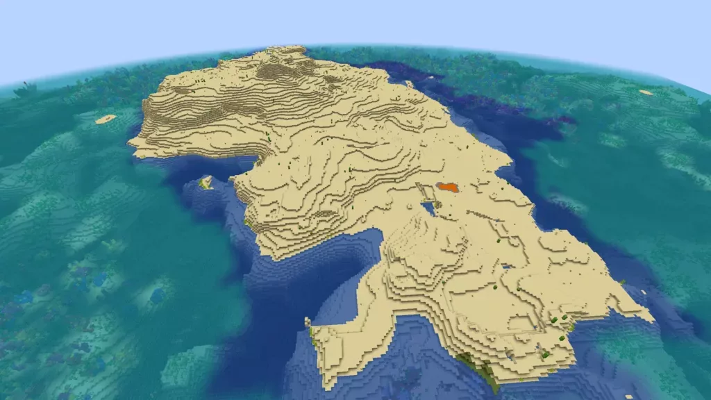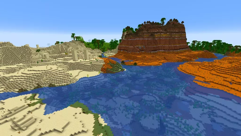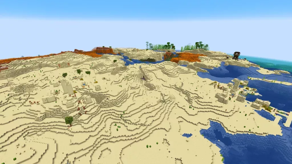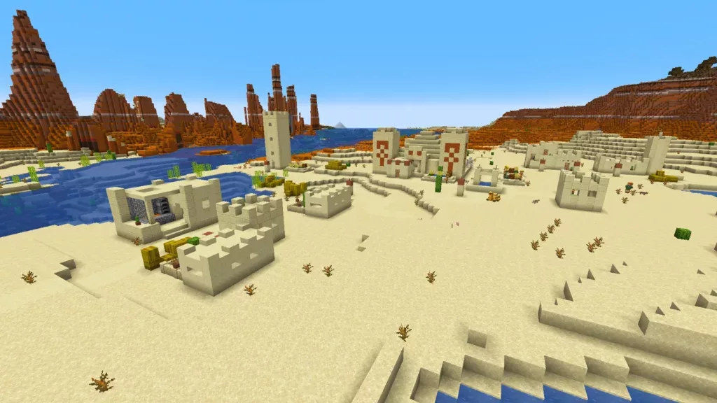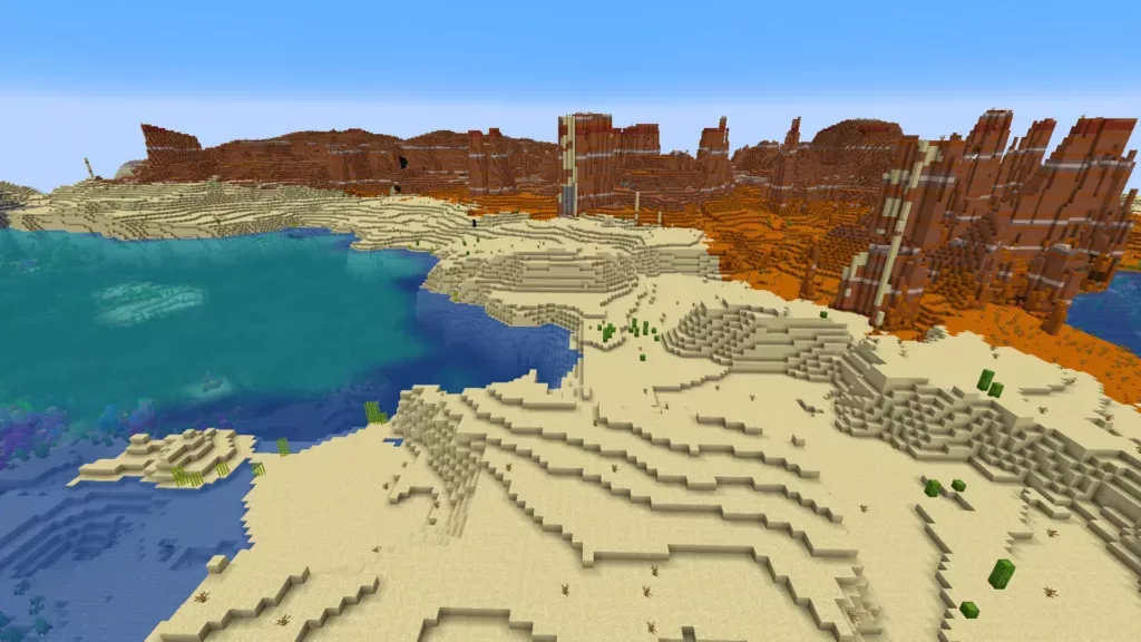 따뜻한 사막 바다 시드는 당신을 사막과 바다 바이옴의 이상한 혼합 한가운데 스폰시키며, 색상으로 가득하고 난파선 전리품이 있는 산호가 풍부한 수역 근처에 배치합니다. 스폰에 가까운 시련의 방이 곳곳에 있어 생존 플레이에 경치가 좋고 실용적이며 추가 도전과 보상을 제공합니다.