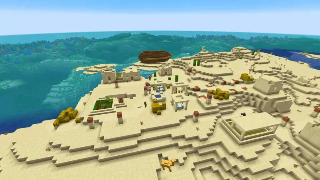 이런 종류의 마인크래프트 월드 시드는 사막 지형과 신비로운 분위기에 둘러싸인 마을을 찾는 플레이어에게 훌륭한 선택입니다. 특히 이 시드는 제한된 자원 속에서 식량과 재료를 찾아 헤매는 데 초점을 맞추고 있습니다.