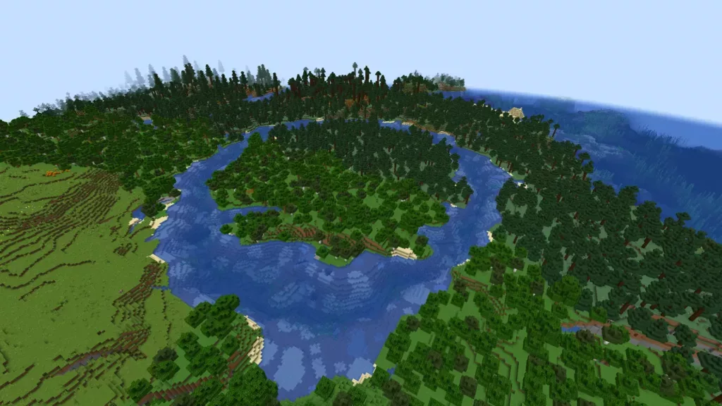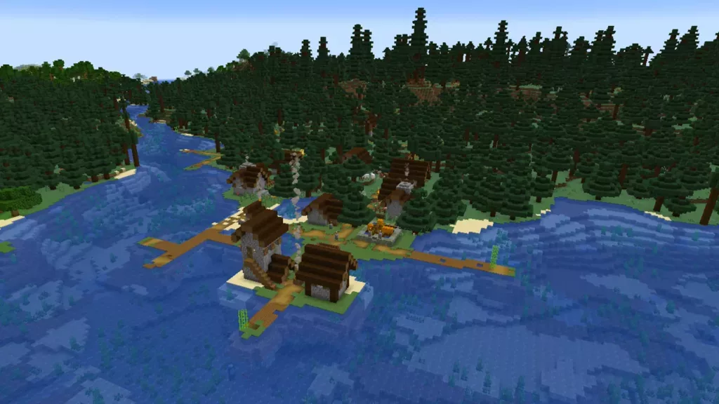 - 마을과 호수가 있는 타이가 바이옴 (X: -181, Z: 309)