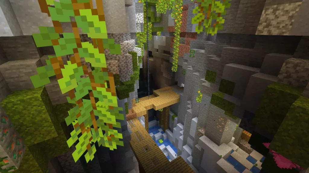 이 시드는 당신을 지금까지 볼 수 있는 가장 극적인 지하 바이옴 중 하나에 바로 떨어뜨립니다. 몇 걸음만 들어가면 천장에서 떨어지는 녹지와 함께 거대하고 개방적이며 무성한 동굴을 만나게 됩니다. 폭포와 여러 진입 지점이 있어 최고의 어드벤처 게임에서 바로 나온 것처럼 느껴집니다.