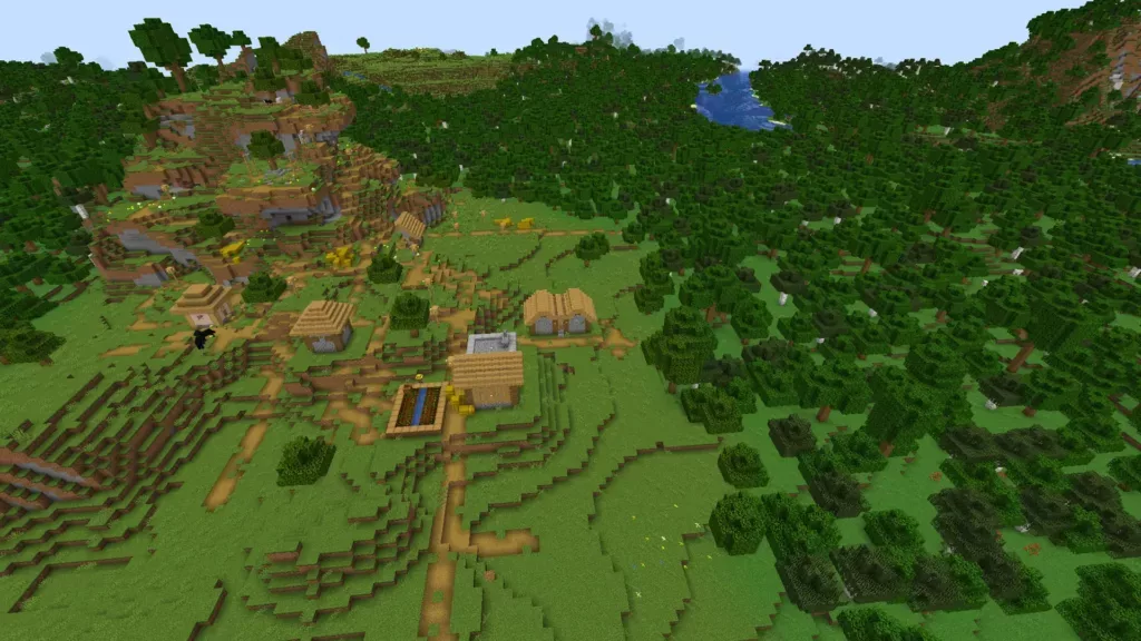 이것은 자원을 위한 여러 시작점을 제공하는 시드 중 하나입니다. 스폰하는 순간 협곡 옆 위치 근처에 마을이 맞이합니다. 이것은 처음부터 많은 자원을 모으는 편리한 방법입니다.
