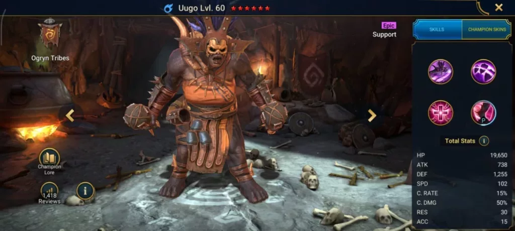 우고는 버프 차단과 그녀가 마지막으로 서 있는 챔피언일 때 발동되는 독특한 팀 부활 능력을 제공합니다. 이런 강력한 리셋 덕분에 히드라 클랜 보스와 같은 특정 보스 전투를 거의 혼자서 무력화할 수 있습니다. 그녀의 버프 제거 능력은 방어력 증가나 디버프 차단에 의존하는 팀을 상대로 아레나에서 유용하며, 부활 능력은 던전의 웨이브 콘텐츠에 대한 보험을 제공합니다.
