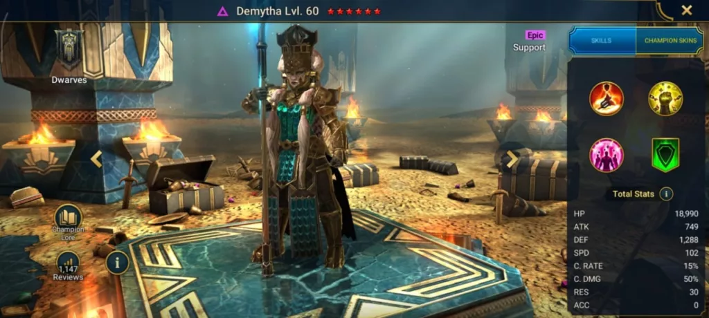 마찬가지로 데미타(에픽)는 클랜 보스에서 전통적인 힐과 방어 스탯의 필요성을 완전히 우회하는 불사 전략을 가능하게 하여 특정 전략과 콘텐츠에 대해 전설 챔피언보다 강력합니다. 한편, 일부 에픽 챔피언은 그들을 구축하는 데 필요한 자원을 정당화하지 못하는 점진적인 개선을 제공합니다.