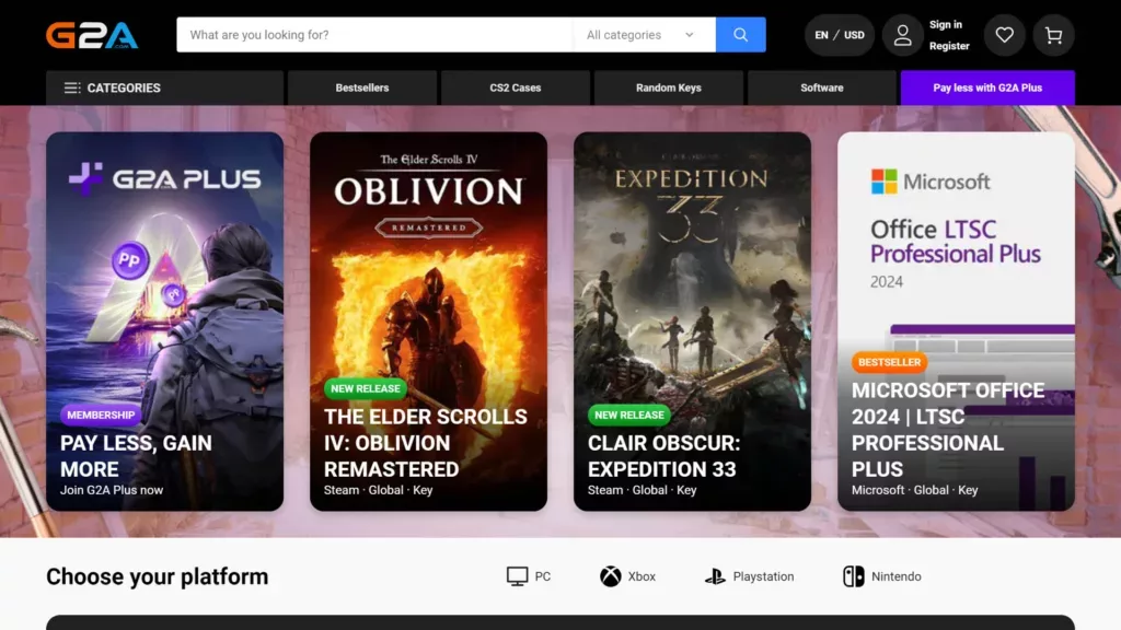 G2A는 키 기반 플랫폼입니다. 게임을 클라이언트에서 직접 다운로드하는 대신, 소프트웨어에 접속할 수 있는 키를 받게 됩니다. G2A는 다양한 개발사의 게임뿐만 아니라 Microsoft Office와 같은 소프트웨어, Steam 기프트 카드까지 판매하여 게이머에게 완벽한 원스톱 쇼핑 장소입니다.